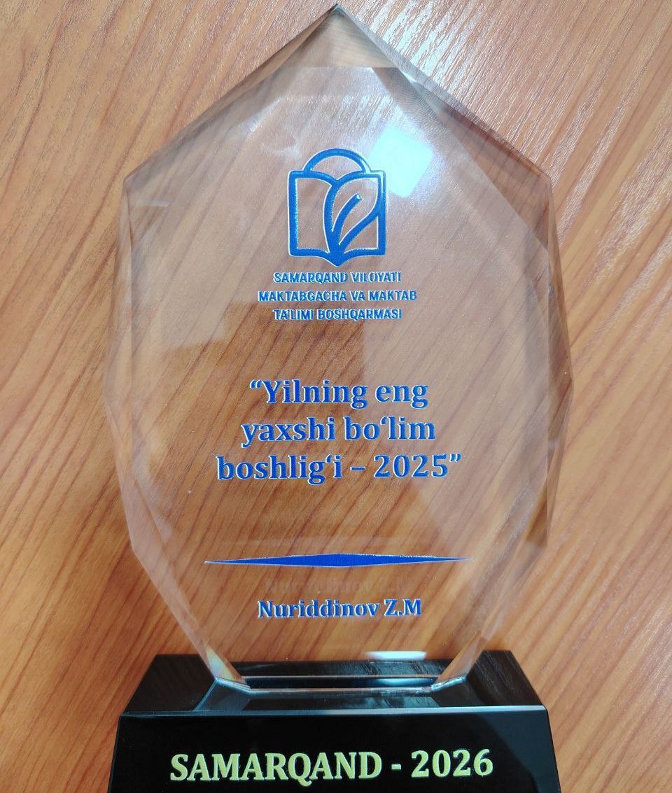 2025-YILDA SAMARALI ISHLAGAN XODIMLAR TAQDIRLANDI. “Yilning eng yaxshi bo‘lim boshlig‘i – 2025” Samarqand shahar Maktabgacha va maktab ta’limi bo‘limi boshlig‘i Nuriddinov Zayniddin Mehriddinovich.