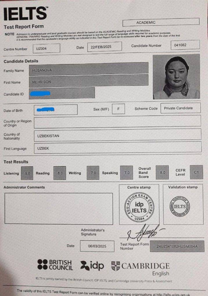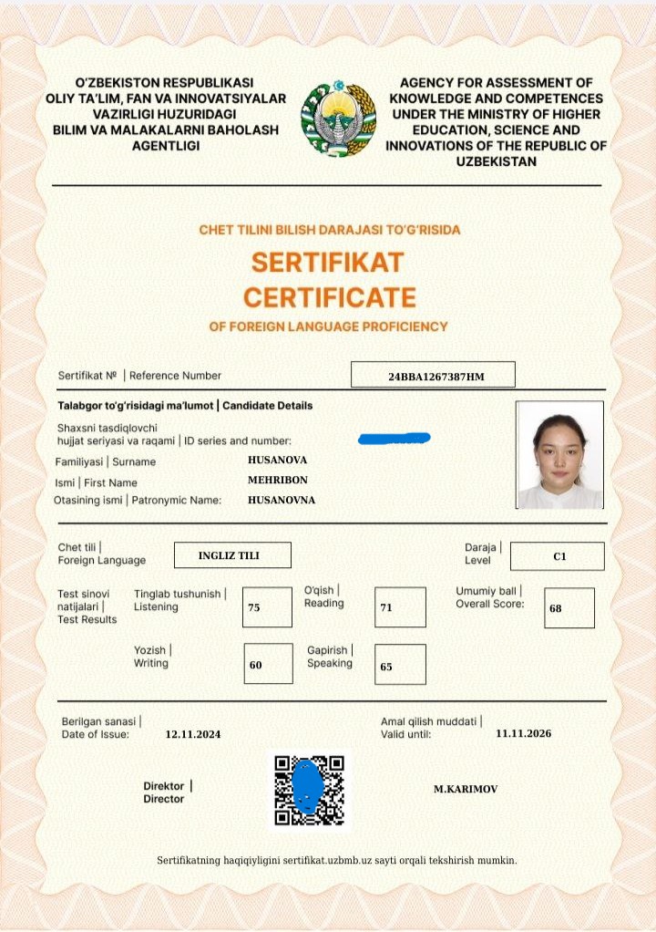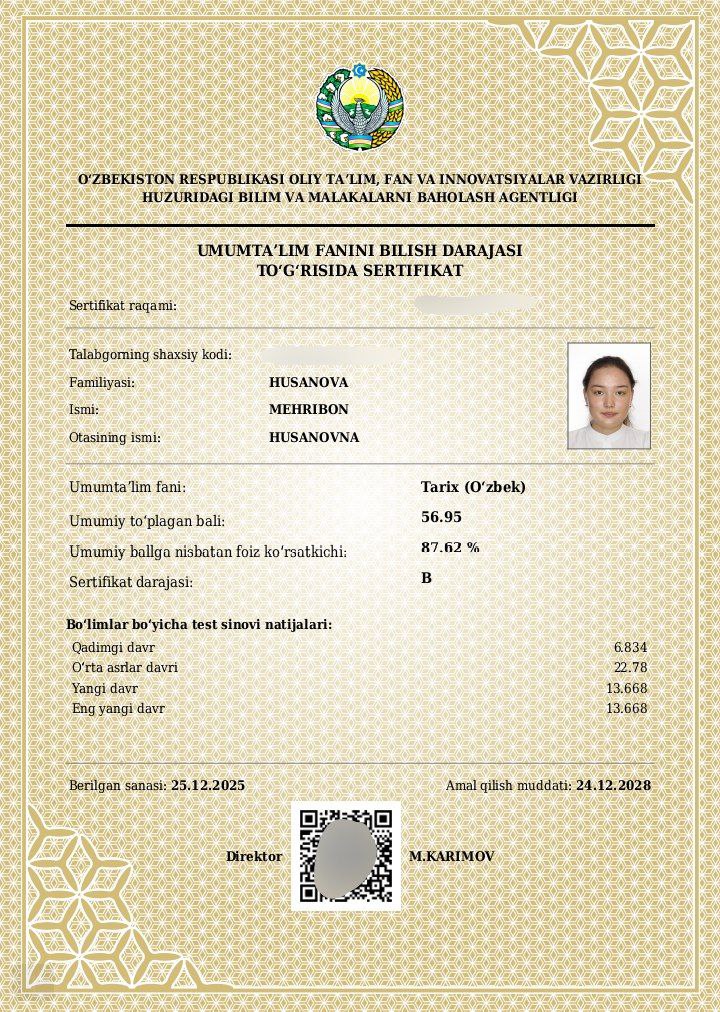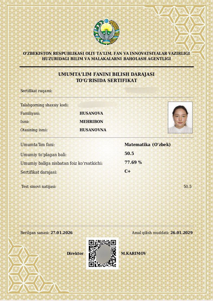 Samarqand shahar 53-maktabning 11-sinf o'quvchisi Husanova Mehribon Husanovna 4 ta fandan 5 ta xalqaro va milliy sertifikatlarni qo'lga kiritib, davlat imtihonlarini olish mumkin bo'lgan 189 ballni muddatidan oldin to'pladi. Muddatidan oldin talabalikni naqd qildi. U ingliz tili fanidan CEFR C1 (68 ball) va IELTS 8 ball, o'zbek tili va adabiyot fanidan A+ (72.05 ball (100%)), tarix fanidan B (56.95 ball (87.62%)), matematika fanidan C+ (50.5 ball (77.69%)) natijalarni qo'lga kiritdi. Mehribonga kelgusidagi ilmiy faoliyatiga zafarlar tilaymiz!